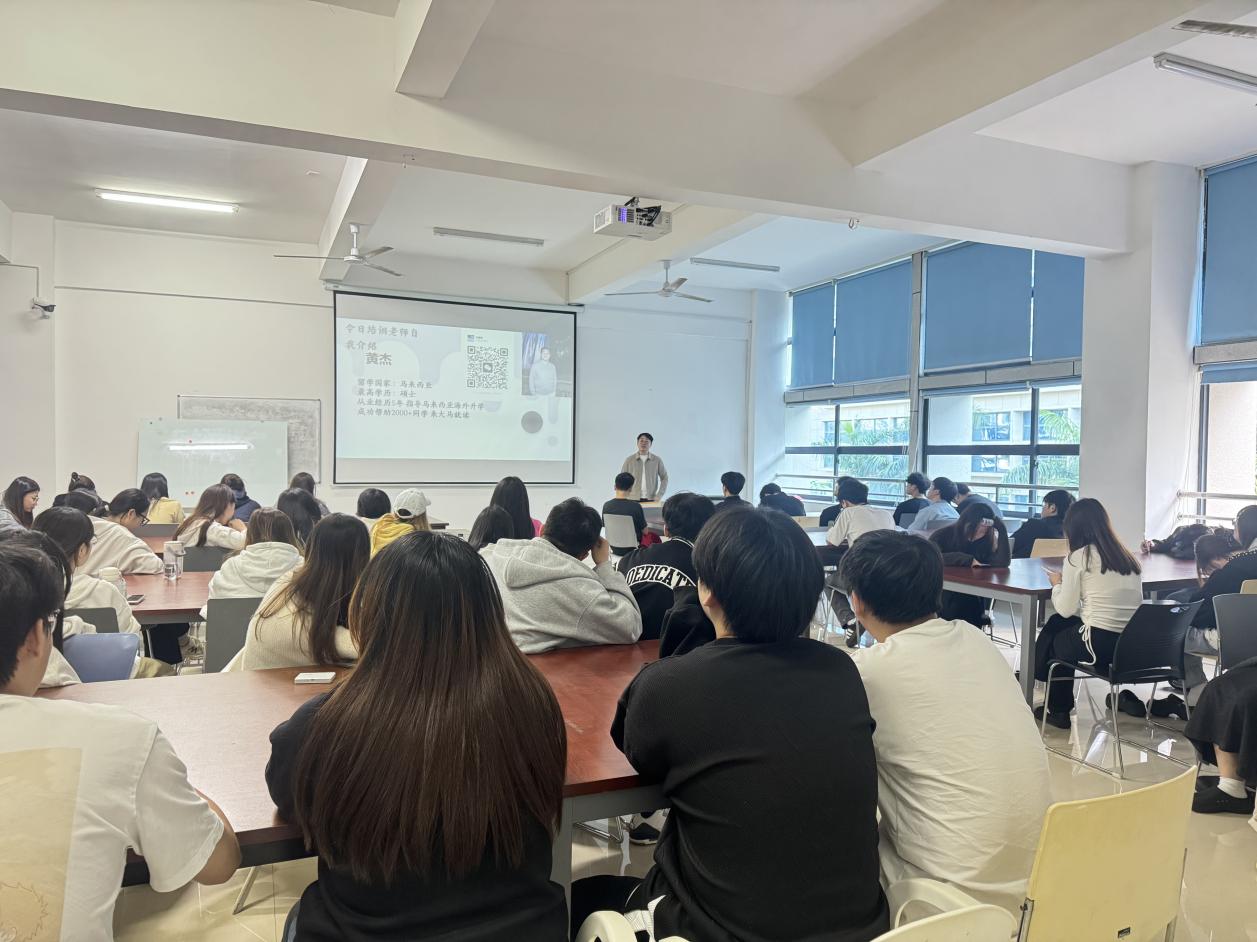 海外学院黄杰老师详细介绍了我校马来西亚留学项目。他从地理位置、留学优势、合作院校等方面展开,重点推介了英迪大学、世纪大学及拉曼大学三所合作高校,为有意向前往东南亚深造的同学提供了明确指引。